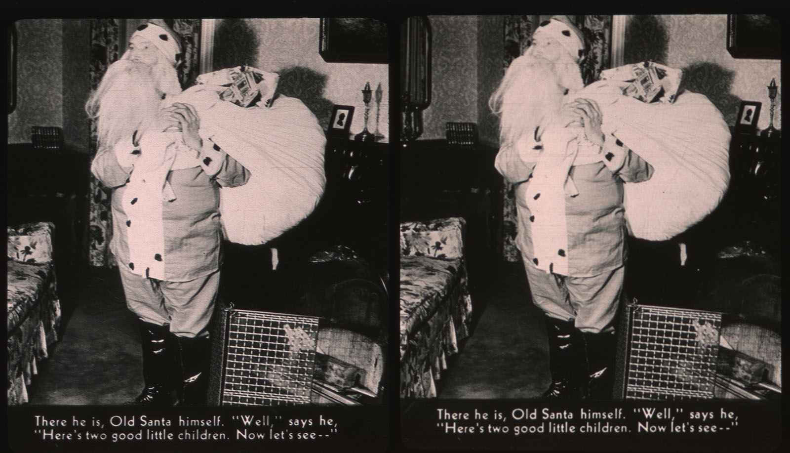 Huh? Are we back with the crapsack Santa from the Girls series previously? Note that our debonair Santa from two frames gone, with his spiffy Santa suit, has been replaced by this other guy – with his glued-on-felt-shapes outfit. I don’t know if this was due to reshoots from the original 1933 film (since my print is from 1939, and Tru Vue changed out images within particular strips from time to time, this is entirely possible) – or whether this rather cheesy outfit was just a staple of Tru Vue Santa photography all along. In any case, at least he’s not playing with doll’s heads, and there are none poking out of his sack.