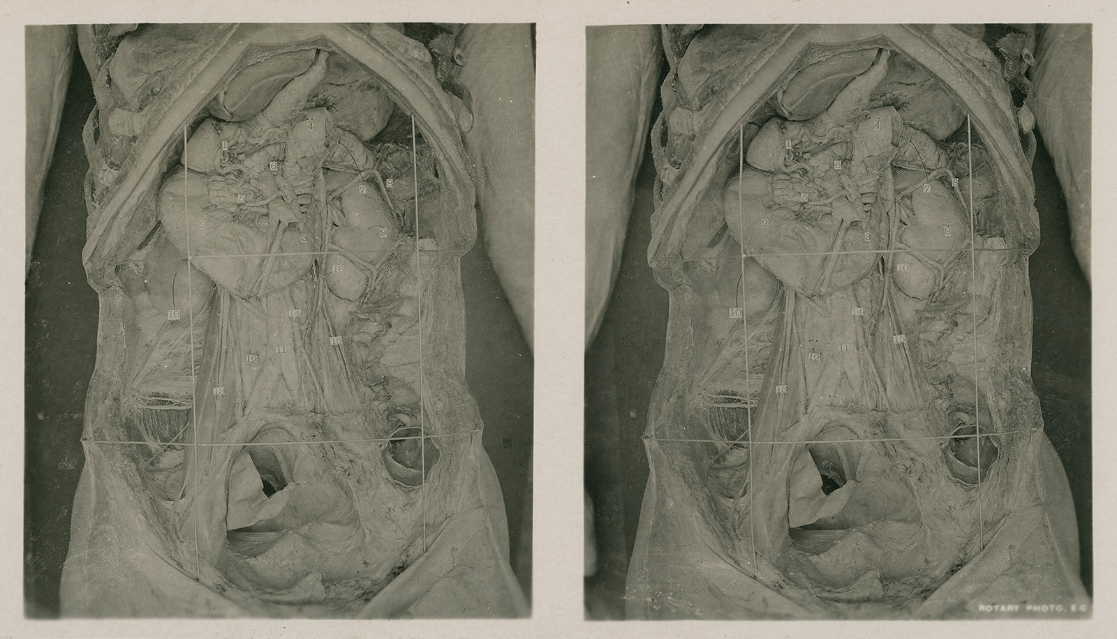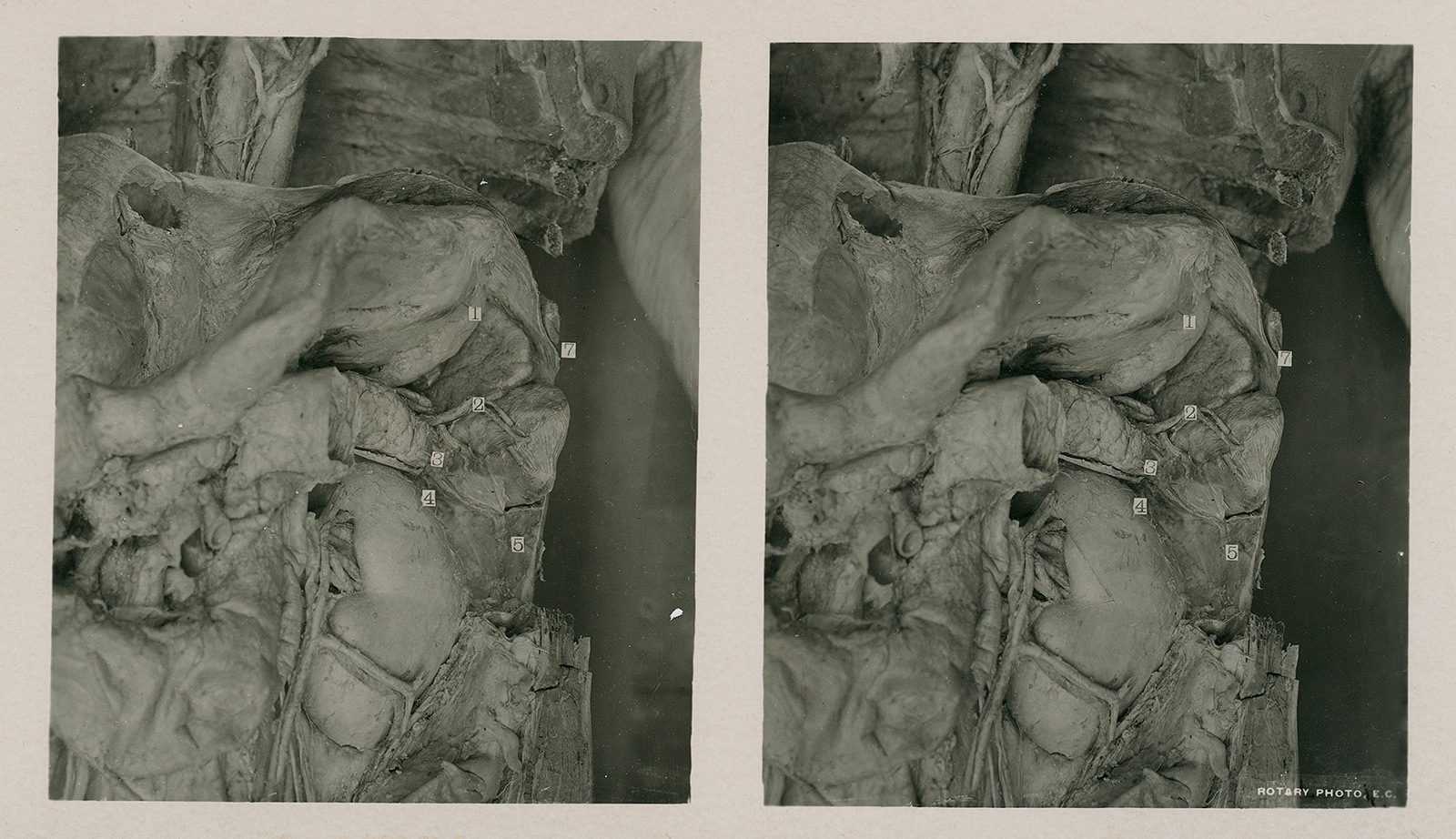 But students in far-away countries like America could not sit in on these procedures, and so over a dozen volumes of anatomical stereoviews, each pasted onto the bottom of an explanation card, were produced – in Edinburgh naturally. I will present seven such images below – as stereo pairs for parallel viewing first. Second will come the full sheets, and finally, as always, an anaglyph gallery. Enjoy!