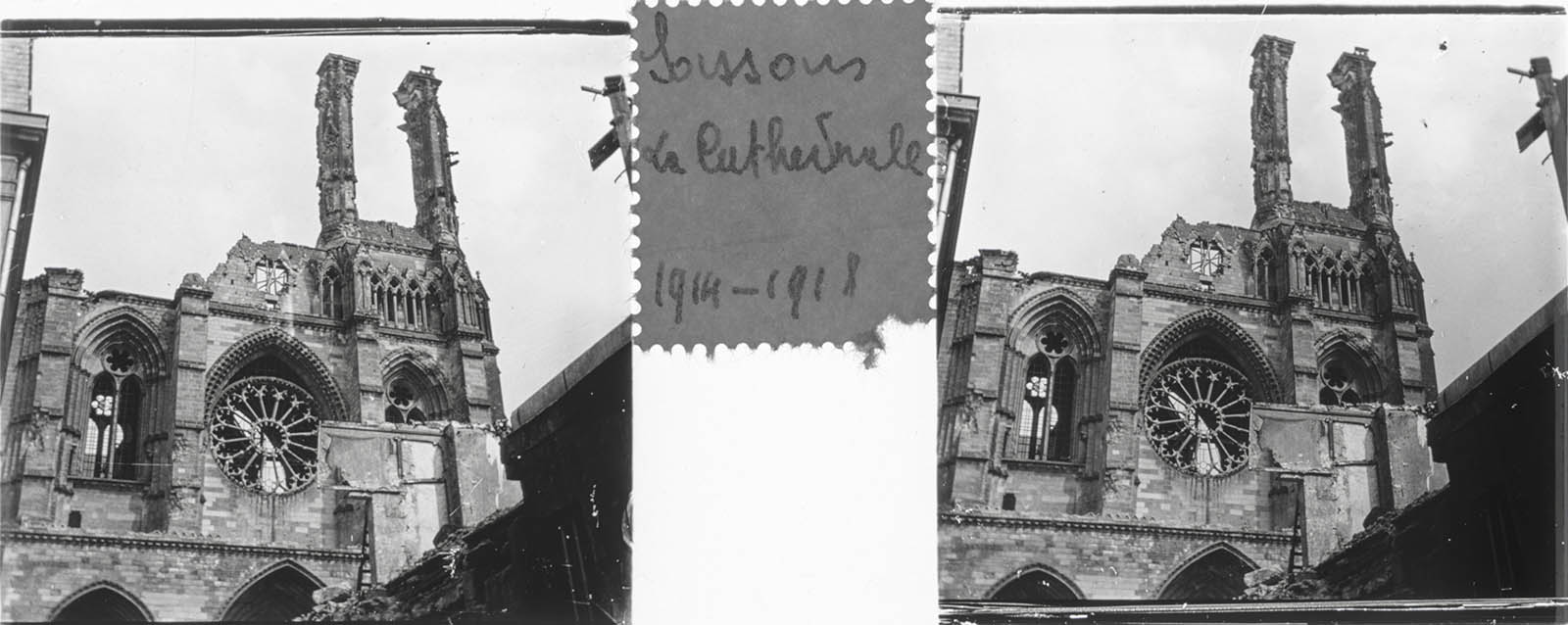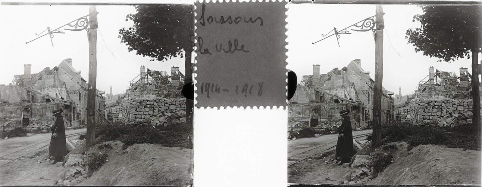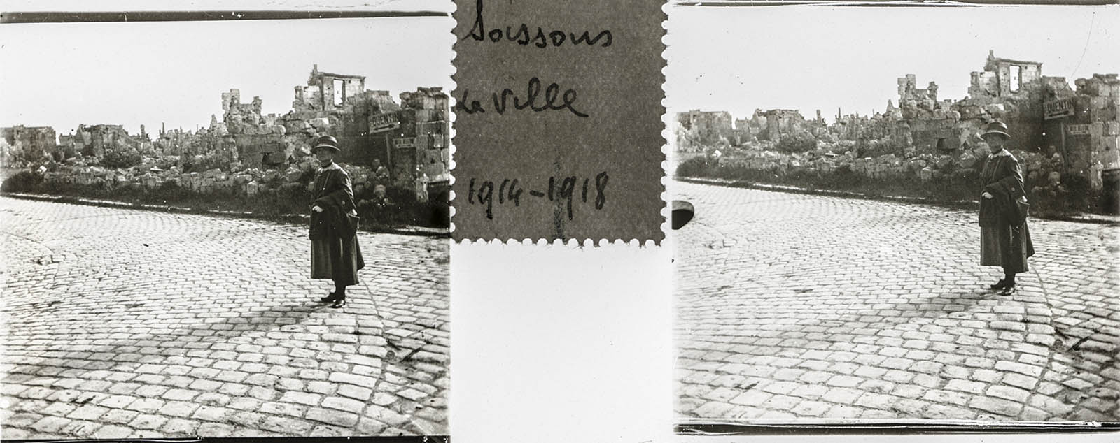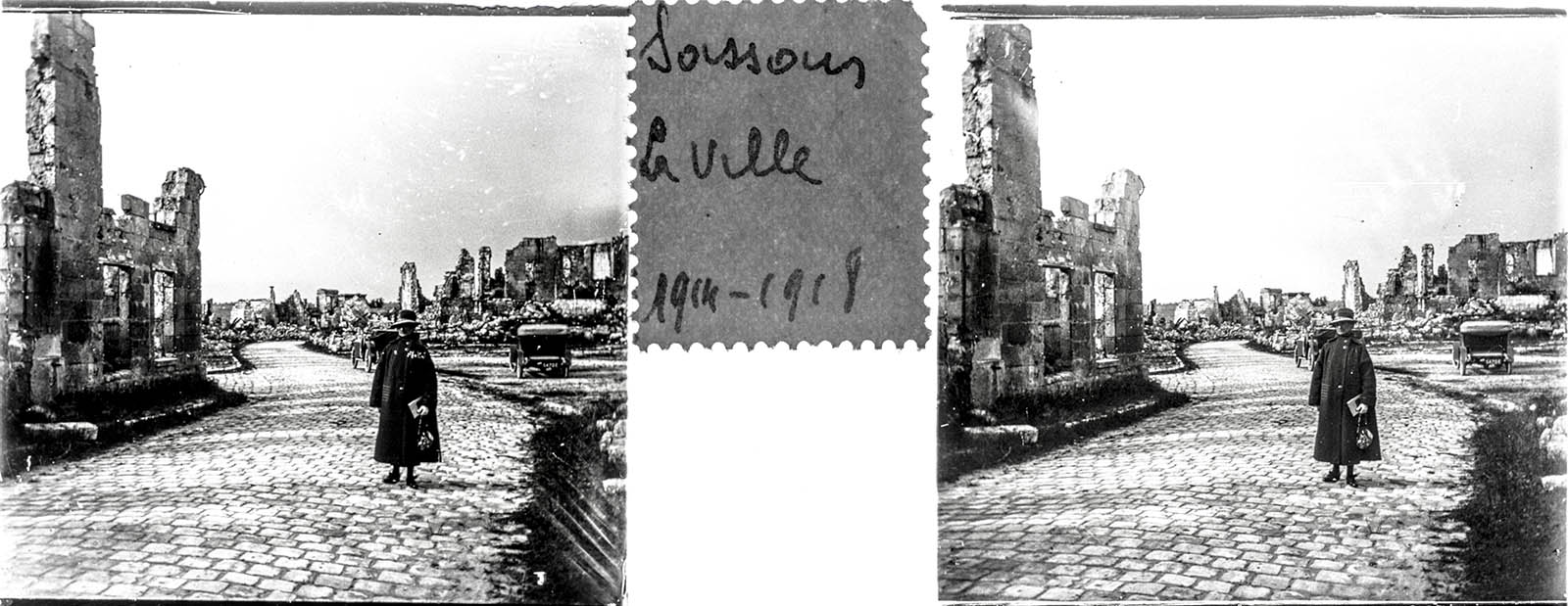 There is a lone figure in most of the ten photos contained in the unlabeled diapositive box, and no contextual clues other than the captions affixed to the slides with a seemingly common sort of sticker in between the images on each. The figure is that of a woman – rigid, with a stony expression, standing amidst the wreckage of war, and in one case leaning against their car (the number plate,” 3470-E”, is the same near the Cathedral and near what was left after the French Revolution of the Abbey). With no other people in frame, even with vast expanses of the commune visible, she takes on a ghoulish appearance. So without further ado, meet the Ghoul of Soissons: