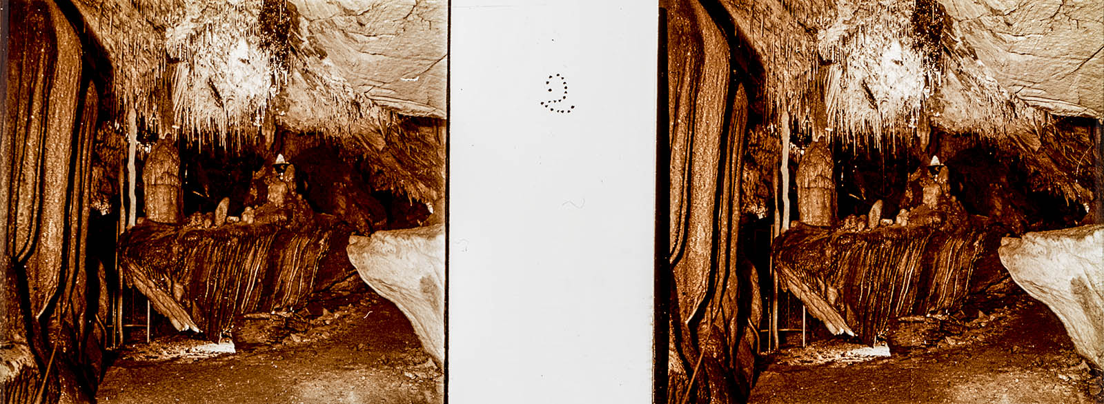 Bruguiere was a manufacturer that created exemplary quality 45×107″ stereoviews in postwar 1940s, before switching to 35mm film in 4-up sets to be fed into a stereoscope similar to a Lestrade. While I’m generally uninterested in most of the subject matter put out by Bruguiere, there’s no denying the quality of the slides – a thick, somewhat scratch-resistant emulsion with a warm orange tone was used. The views, in general, are nice and crisp. So when I found one that translated roughly to “Cave of Courniou”, I decided to grab it – I always find caves to be a fun afternoon. It just arrived in the mail yesterday – let’s take a look, shall we?